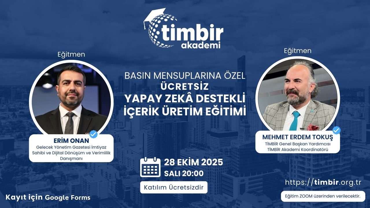TİMBİR Akademi koordinatörü M.Erdem TOKUŞ, “Gazeteciliğin geleceği yapay zekâ ile şekilleniyor. Bu dönüşümü doğru anlamak ve etik şekilde uygulamak için basın mensuplarına özel eğitimler düzenliyoruz. Dijital dönüşüm danışmanı Erim Onan ve ben denizin bilgi birikimiyle bu programın medya profesyonellerine önemli katkılar sunacağına inanıyoruz.” açıklamasında bulundu.