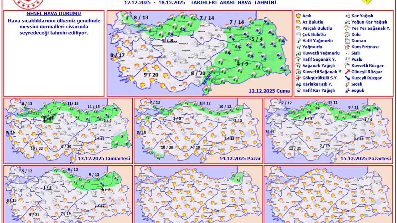 Meteoroloji Genel Müdürlüğü, 12–18 Aralık 2025 tarihlerini kapsayan hava tahmin raporunu yayımladı. Yapılan değerlendirmelere göre, hava sıcaklıkları ülke genelinde mevsim normalleri civarında seyredecek. Haftanın büyük bölümünde yağışlı sistemlerin etkisi dikkat çekiyor.