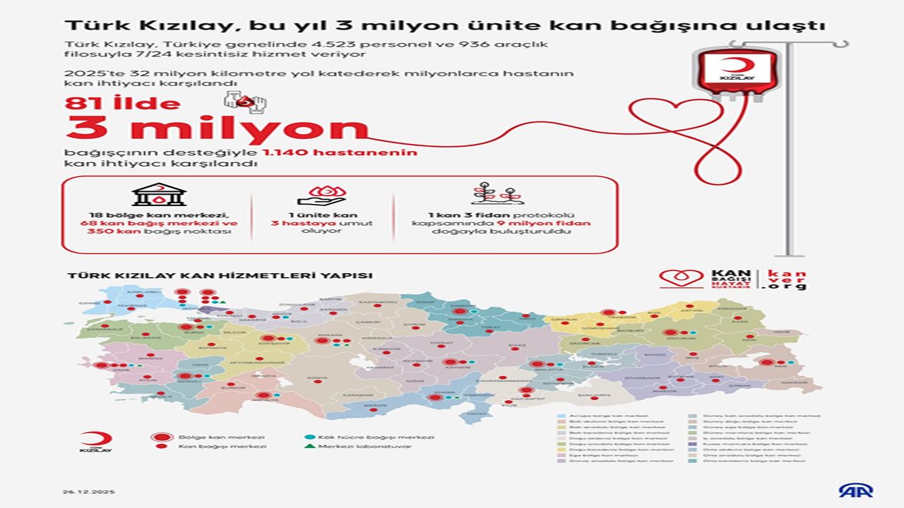 Türk Kızılay, Türkiye genelinde 4.523 personel ve 936 araçlık filosuyla 7/24 kesintisiz hizmet veriyor. 2025'te 32 milyon kilometrelik yol katederek milyonlarca hastanın kan ihtiyacı karşılandı.