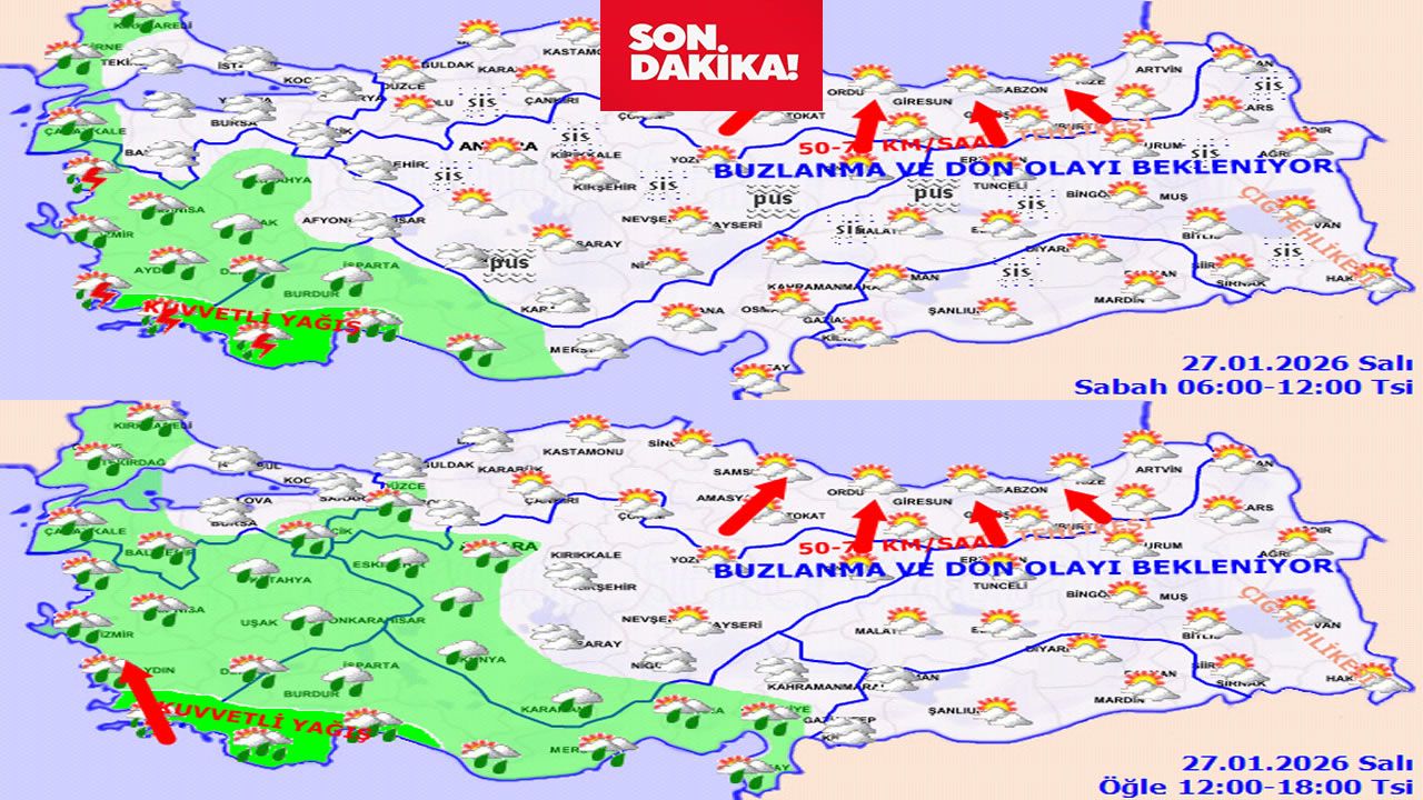 - Ege: Sağanak ve yer yer kuvvetli gök gürültülü yağış (İzmir 10/15°C, Muğla 6/8°C)