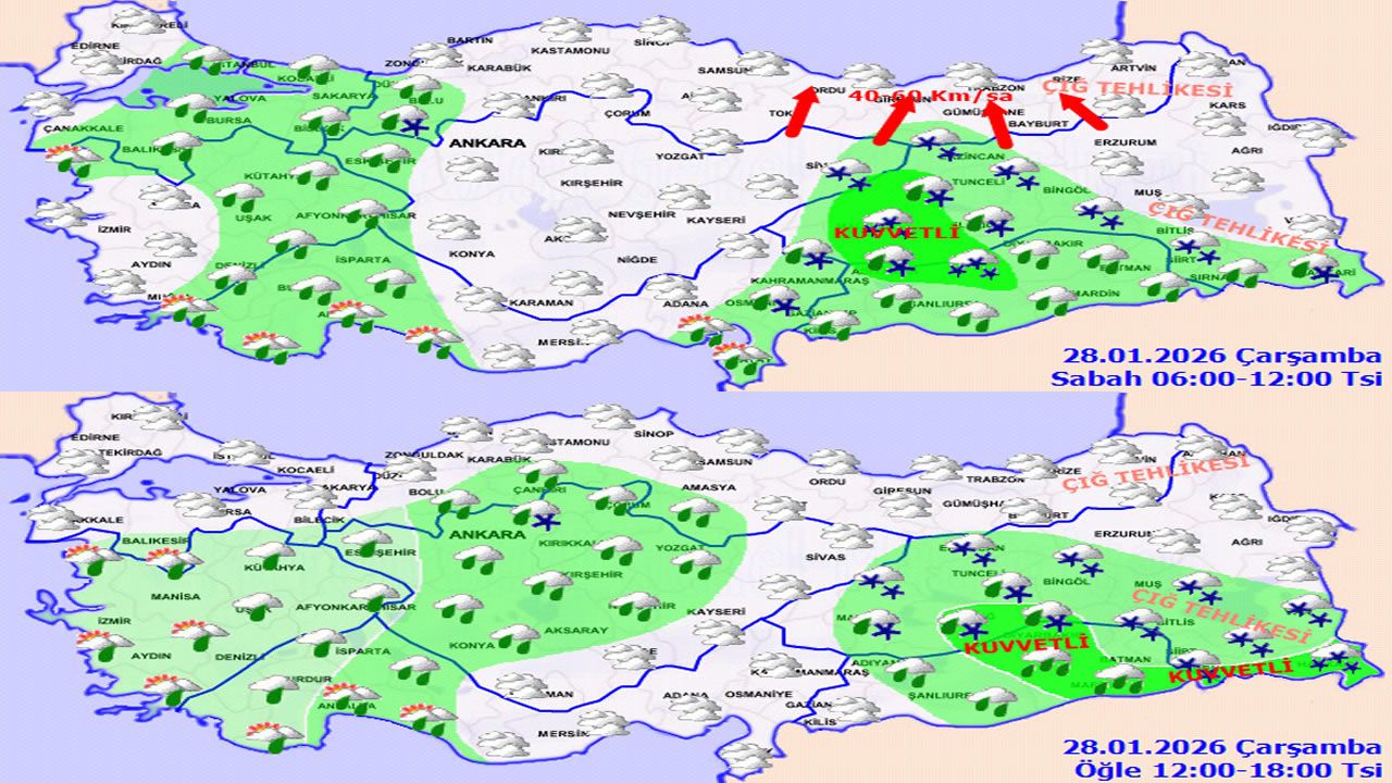 Meteoroloji Genel Müdürlüğü’nün 28 Ocak – 3 Şubat tarihlerini kapsayan haftalık tahmin raporuna göre Türkiye genelinde yağışlı hava etkisini sürdürecek. Batı ve kıyı kesimlerde sağanak, iç ve doğu bölgelerde ise kar yağışı beklenirken, bazı bölgelerde kuvvetli rüzgar ve çığ riski öne çıkıyor.