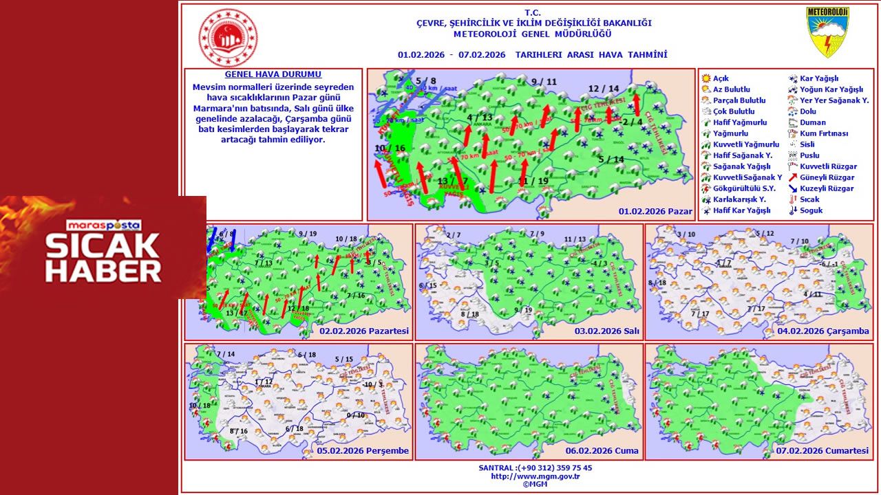 Meteoroloji Genel Müdürlüğü’nün 1–7 Şubat tarihlerini kapsayan haftalık hava tahmin raporuna göre Türkiye genelinde yağışlı ve yer yer sert hava koşulları etkili olacak. Hafta başında özellikle batı bölgelerde kuvvetli rüzgâr ve sağanak, iç ve doğu kesimlerde ise karla karışık yağmur ve kar yağışı öne çıkıyor.