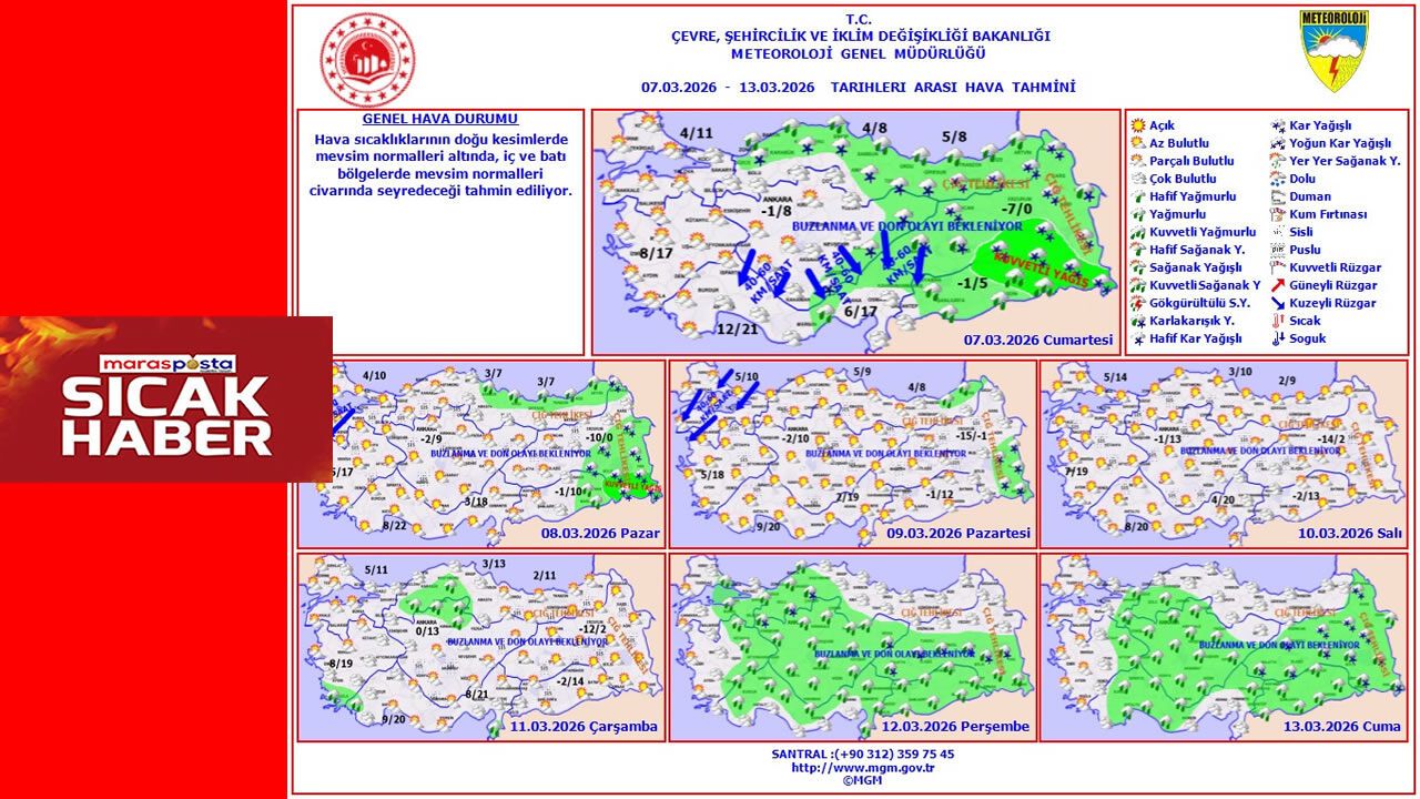 Meteoroloji Genel Müdürlüğü’nün 7–13 Mart 2026 tarihlerini kapsayan haftalık hava tahminine göre Türkiye genelinde hava sıcaklıkları özellikle doğu bölgelerinde mevsim normallerinin altına düşecek. Batı kesimlerde ise sıcaklıkların genel olarak mevsim normalleri civarında seyretmesi bekleniyor.