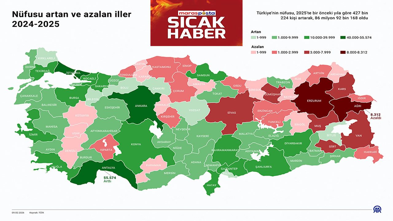 2024 yılında bir önceki yıla göre 40 ilin nüfusu azalırken, 2025 yılında 33 ilin nüfusunun azaldığı belirlendi.