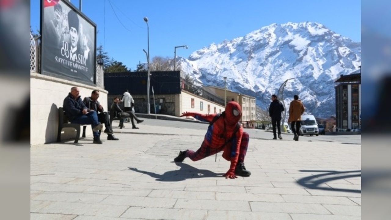 Türkiye'yi "Örümcek Adam" kostümüyle gezme hayaliyle memleketi İzmir'den yola çıkan Ayaz Salih Koç, 71'inci şehir olarak geldiği Hakkari'de vatandaşlarla buluştu.