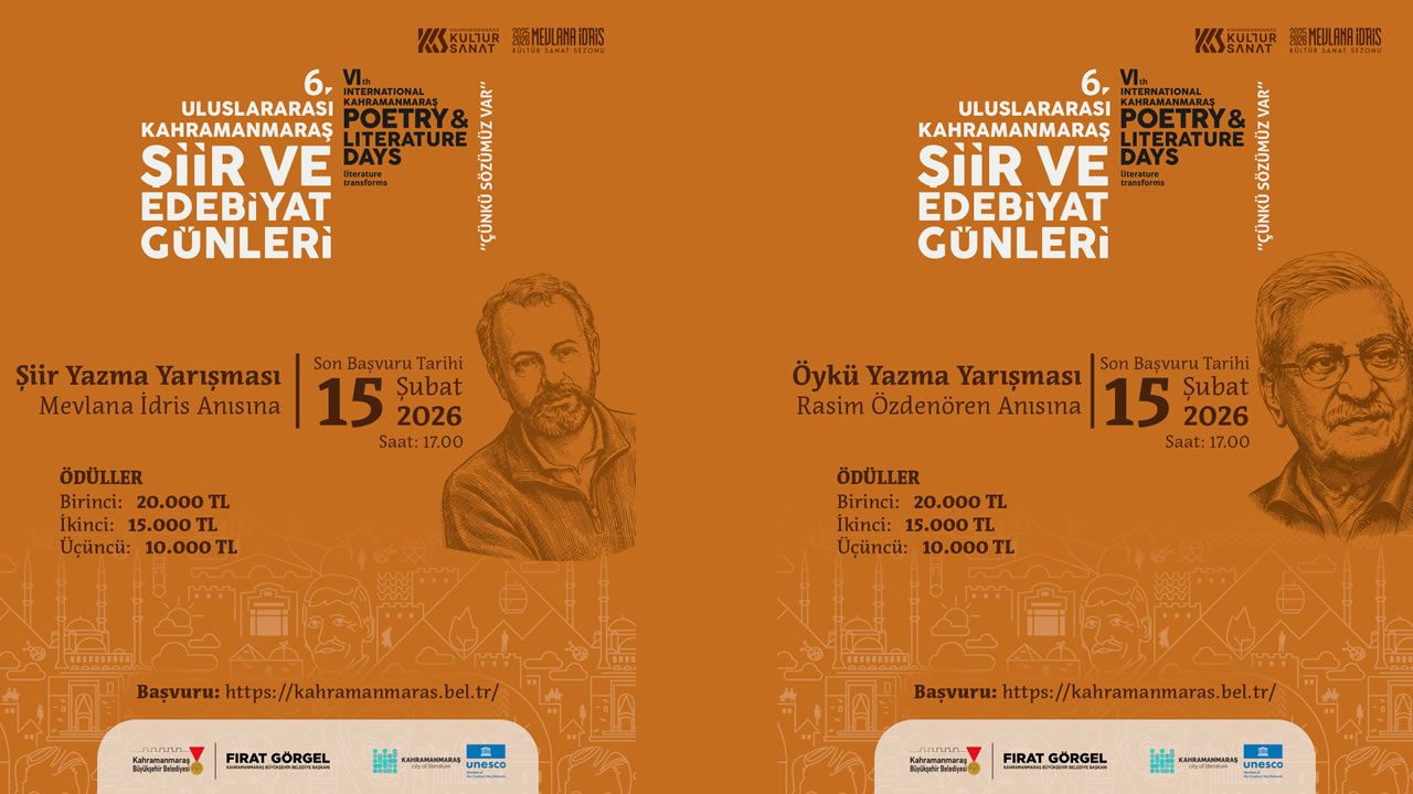 Edebiyatın farklı türlerine kapı aralayan yarışmalarda, başvurular 15 Şubat 2026 tarihine kadar kabul edilecek. Yarışmaya katılmak isteyen edebiyatseverler; katılım şartları, yarışma takvimi ve başvuru formuna https://kahramanmaras.bel.tr/duyuru/2026/01/08/6-uluslararasi-kahramanmaras-siir-ve-edebiyat-gunleri-basvuru-formu internet adresinden ulaşılabiliyor.Kahramanmaraş Büyükşehir Belediyesinden yapılan açıklamada, edebiyatın birleştirici gücüne vurgu yapılarak, yarışmanın hem yeni yeteneklerin keşfedilmesine hem de edebiyatın toplumun her kesimine yayılmasına katkı sunacağı ifade edildi. Açıklamada ayrıca, şiir ve öyküye gönül veren tüm edebiyatseverler yarışmaya davet edildi.