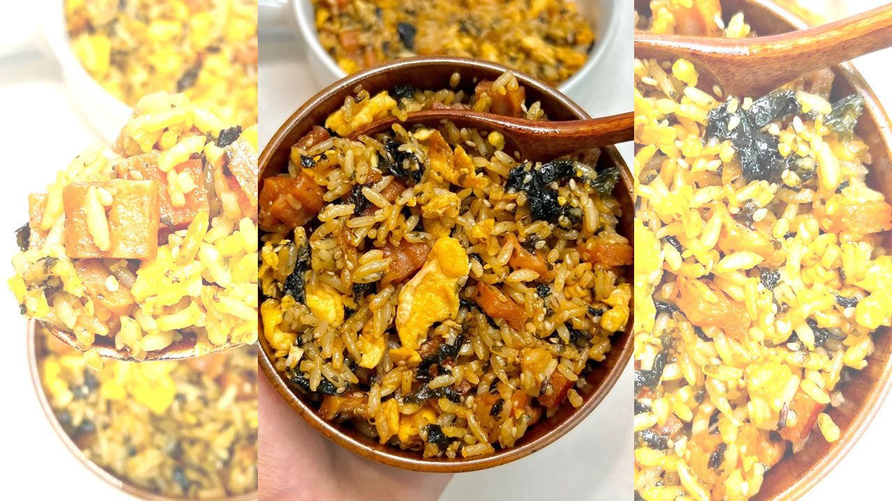 1. Yumurtaları iyice pişene kadar çırpın ve kenara alın. Bir tavada biraz yağ ısıtın ve konserve etleri altın rengi olana kadar kızartın. Tavaya pirinci, doğranmış deniz yosununu ve yumurtaları ekleyin.