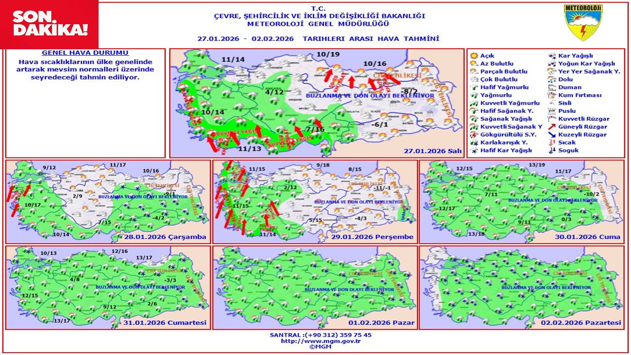 Meteoroloji Genel Müdürlüğü’nün 27 Ocak – 2 Şubat tarihlerini kapsayan haftalık hava tahmin raporuna göre, Türkiye genelinde parçalı ve çok bulutlu bir hava hakim olacak. Yağışların özellikle batı, iç ve kuzey kesimlerde etkili olması beklenirken, birçok il için kar, sağanak ve buzlanma uyarısı yapıldı.