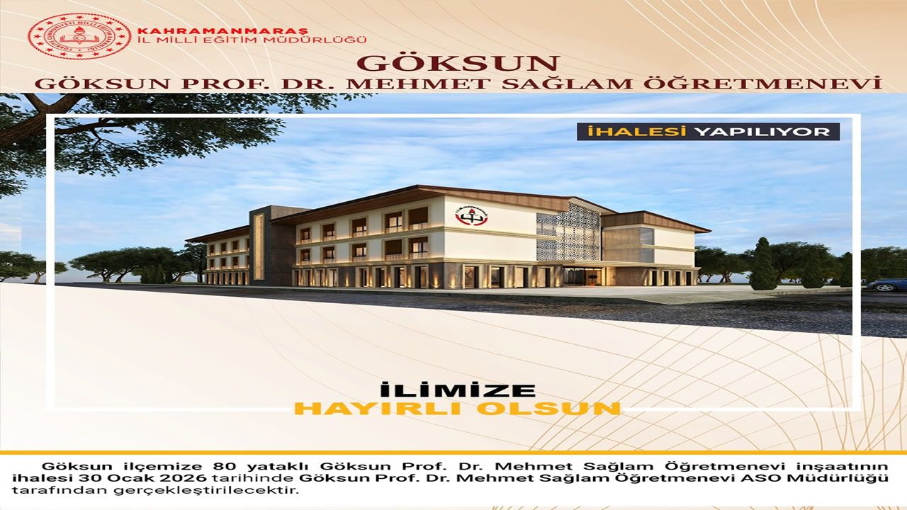 Göksun ilçemiz için önemli bir yatırım daha hayata geçiyor. İlçeye kazandırılacak 80 yataklı Göksun Prof. Dr. Mehmet Sağlam Öğretmenevi inşaatının ihalesi, yeni yılın ilk günlerinde gerçekleştirilecek.