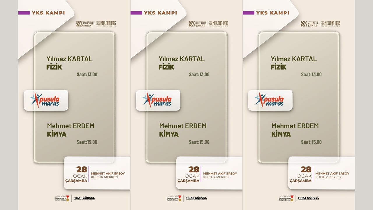 Büyükşehir Belediyesinin üniversite sınavlarına hazırlanan gençler için ücretsiz bir şekilde düzenlediği YKS Kampı, 28 Ocak Çarşamba günü Fizik ve Kimya dersleri ile devam edecek. Mehmet Akif Ersoy Kültür Merkezi’nde düzenlenecek olan kampta Yılmaz Kartal ve Mehmet Erdem öğrencilerle bir araya gelecek.