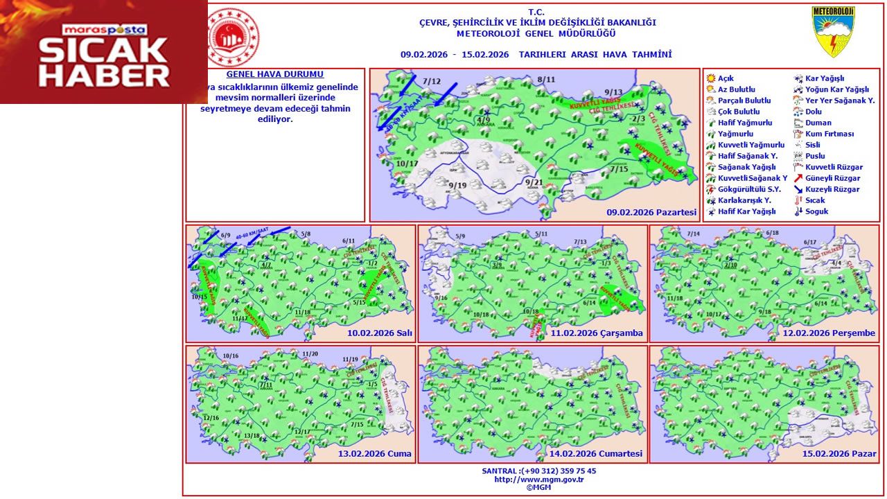 Meteoroloji Genel Müdürlüğü’nün 9–15 Şubat 2026 tarihlerini kapsayan haftalık hava tahmin raporuna göre, Türkiye genelinde hava sıcaklıkları mevsim normallerinin üzerinde seyretmeye devam edecek, ancak yağışlı sistemler yurdun büyük bölümünde etkili olacak.